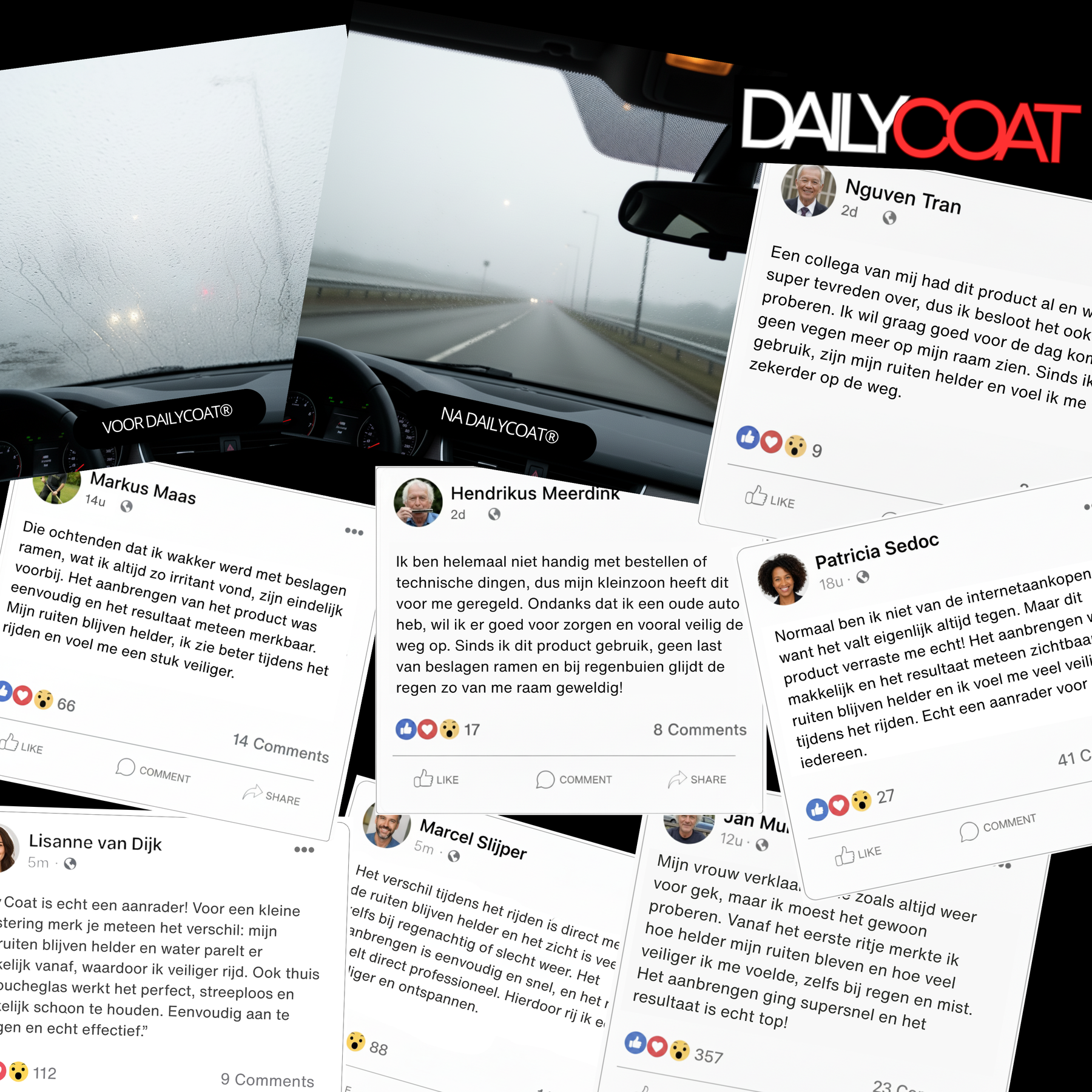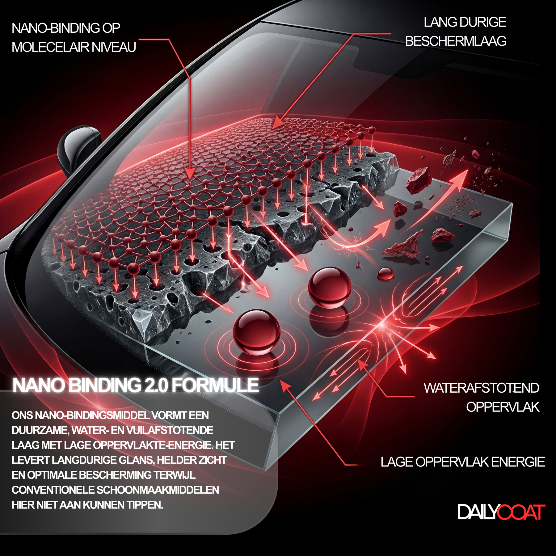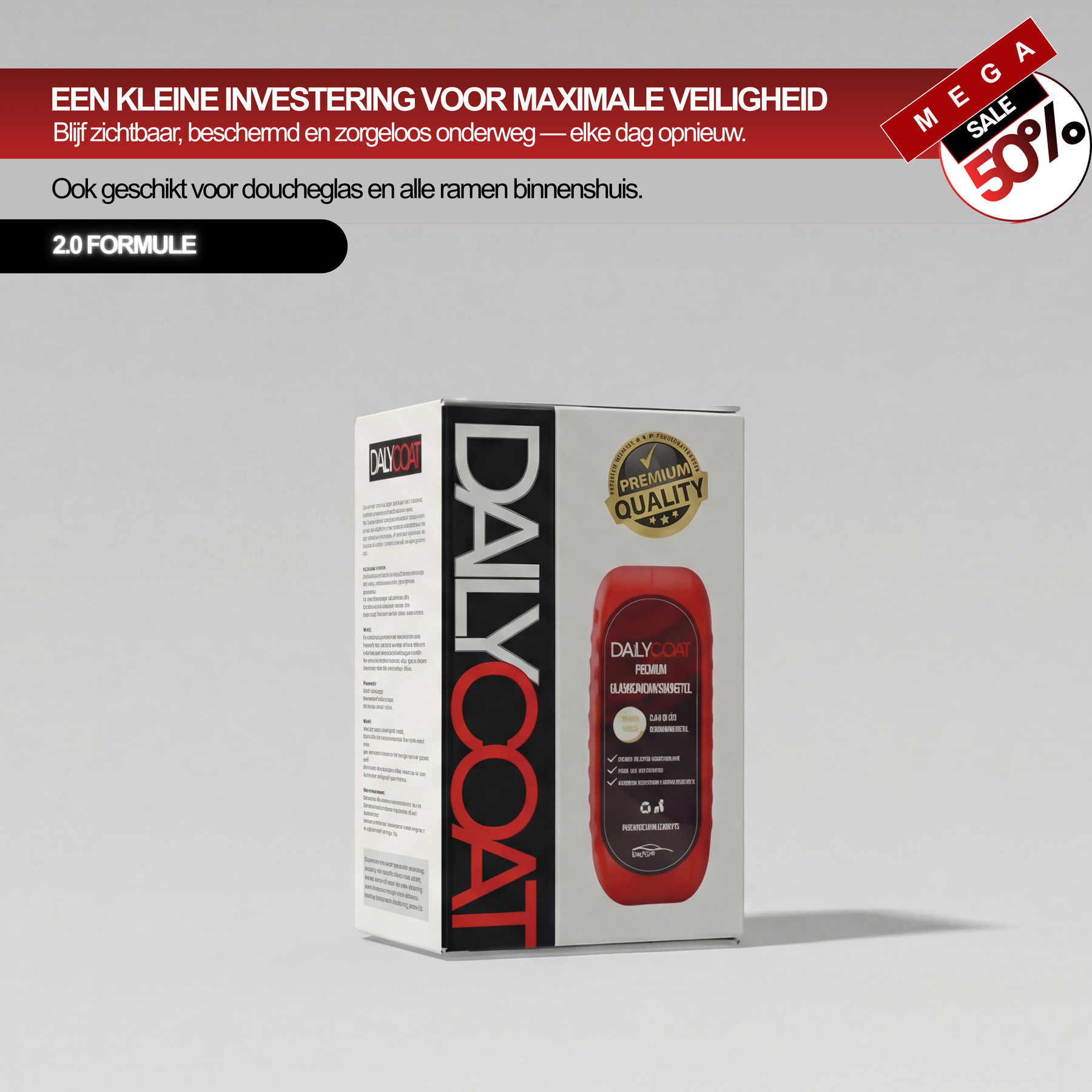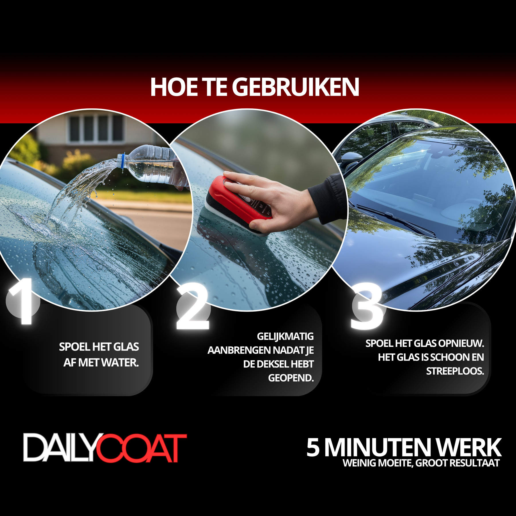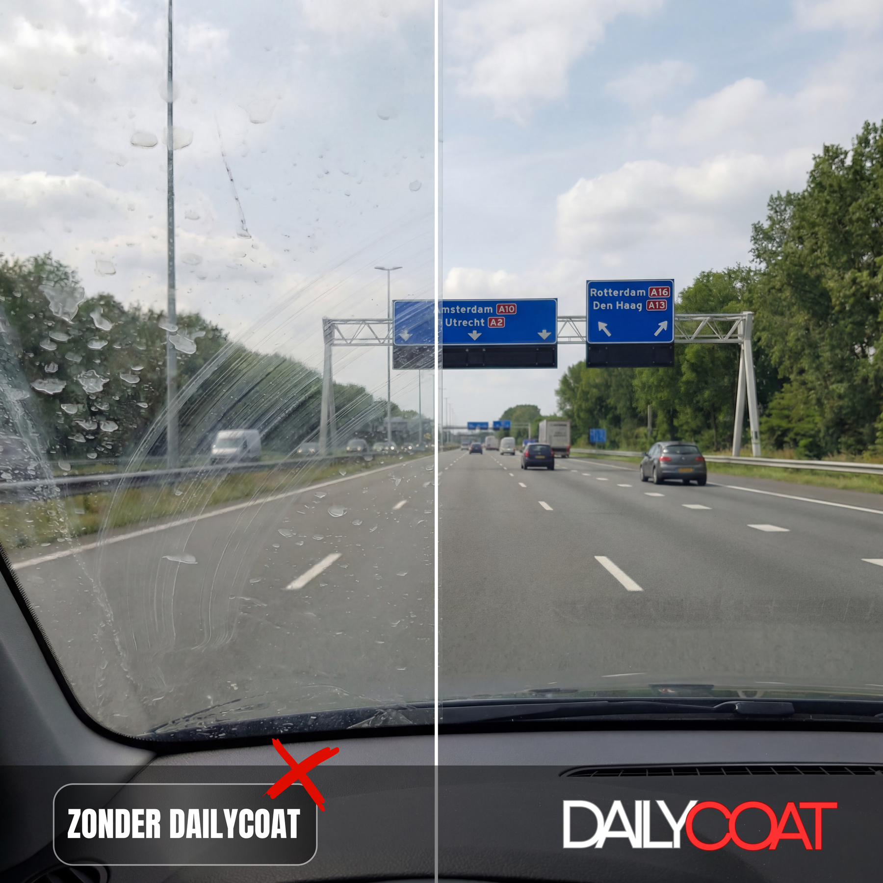DailyCoat creëert een onzichtbare, waterafstotende laag op het glas. Hierdoor parelt water direct af en blijft het oppervlak langer schoon. Ideaal voor autoruiten, douchewanden, ramen en andere glasoppervlakken.